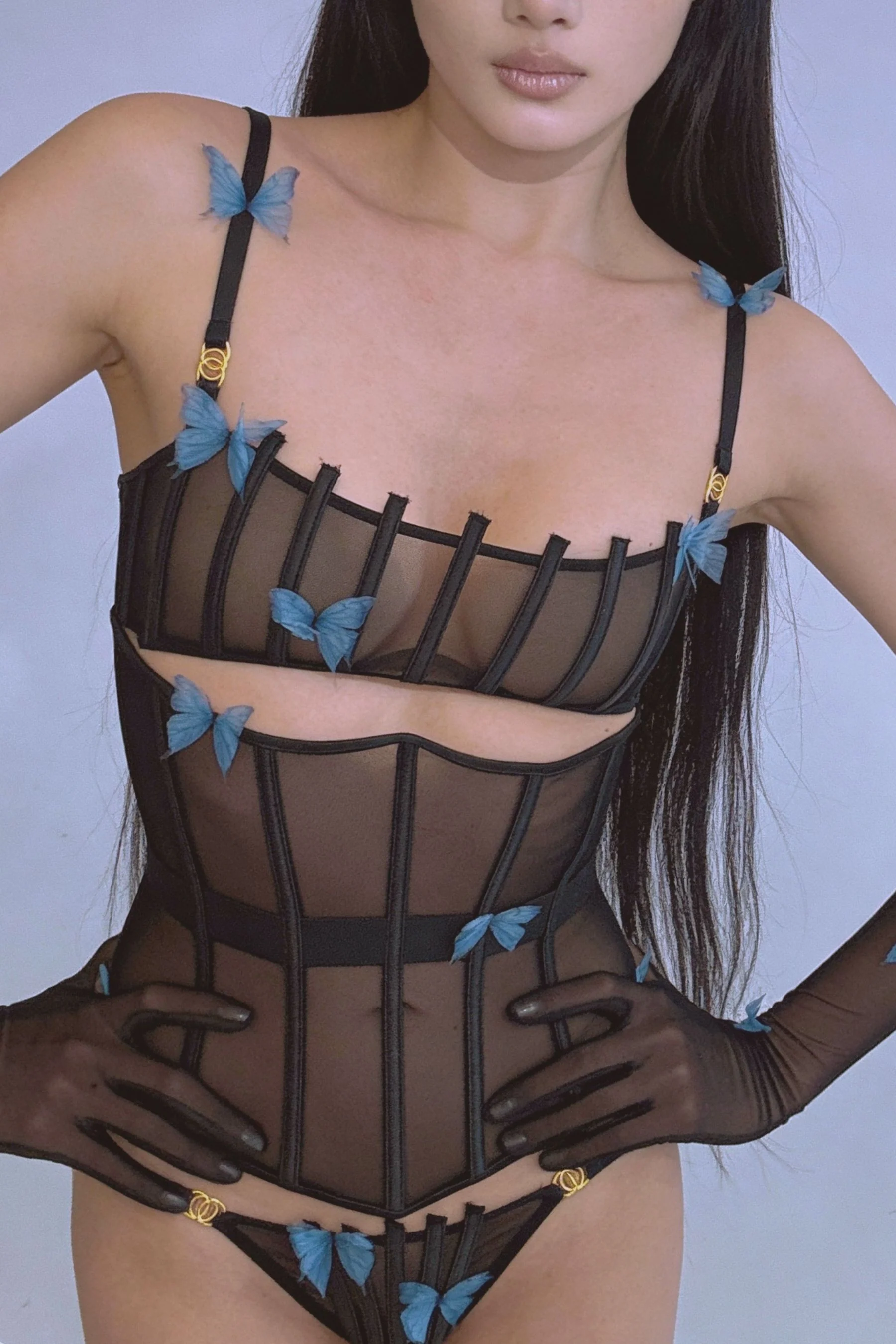 Meet the Morphology Waspie, a statement layer designed to elegantly cinch and sculpt in all the right places. Crafted from sheer stretch black mesh, it features structured vertical boning that defines and cinches the waist without restricting your movement or comfort. Translucent panels maintain a light, barely-there feel, while blue Morpho butterfly accents add a subtle pop of color and dimensional contrast against the sheer black base.
